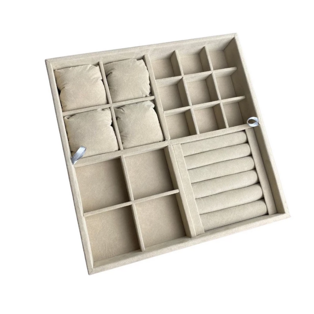 Compartimentos variados para diferentes tipos de joias e acessórios.